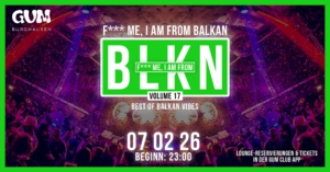 F*** ME, I'AM FROM BLKN | BALKANVIBES | GUM | VOLUME 17WIR GEHEN IN DIE NÄCHSTE RUNDE!VOLUME 17-here we goooo!! Der Countdown läuft: am Samstag den, 07.02.26 um 23 Uhr treffen zum 17.Mal die besten Beats vom Balkan, in unsere GUM EVENTHALLE ein. Taucht ein in ein weiteres Spektakel und lasst Euch verzaubern mit einem Mix von Jala Brat, Nucci, Voyage, sowie Oldies wie Saban Saulic, Halid Beslic, Severina und viele mehr! LOCATION & ANFAHRT:GUM CLUBBurgkirchener Str. 14984489 BurghausenEinlass 23:00…