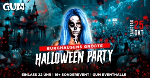HALLOWEEN IN BURGHAUSEN Am 25. Oktober öffnet sich das Tor zur HÖLLE in der GUM Eventhalle – und du bist mittendrin! Erlebt das aufwändigste Halloween-Event der Region, mit gigantischer Dekoration, vielen Specials und der schaurigsten Atmosphäre des Jahres! DIE NACHT, DIE DICH VERFOLGEN WIRD �Traust du dich? ══════ SPECIALS ══════✞ DIE GRÖßTE HALLOWEEN PARTY DER REGION✞ XXL HALLOWEEN DEKO & ANIMATION✞ TAUSENDE HALLOWEEN CANDYS✞ CREEPY SPIDER FLOOR✞ DÜSTERE KONFETTI SHOTS & ICE SHOCK SYSTEM✞ SPECIAL CO2 SHOW✞ BLUTIGE WELCOME DRINK SPRITZEN ══════ MUSIC ══════Wir spielen für…