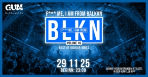 F*** ME, I'AM FROM BLKN | BALKANVIBES | GUM | VOLUME 16WIR GEHEN IN DIE NÄCHSTE RUNDE!VOLUME 16-here we goooo!! Der Countdown läuft: am Samstag den, 29.11.25 um 23 Uhr treffen zum 16.Mal die besten Beats vom Balkan, in unsere GUM EVENTHALLE ein. Taucht ein in ein weiteres Spektakel und lasst Euch verzaubern mit einem Mix von Jala Brat, Nucci, Voyage, sowie Oldies wie Saban Saulic, Halid Beslic, Severina und viele mehr! LOCATION & ANFAHRT:GUM CLUBBurgkirchener Str. 14984489 Burghausen TICKETS:…